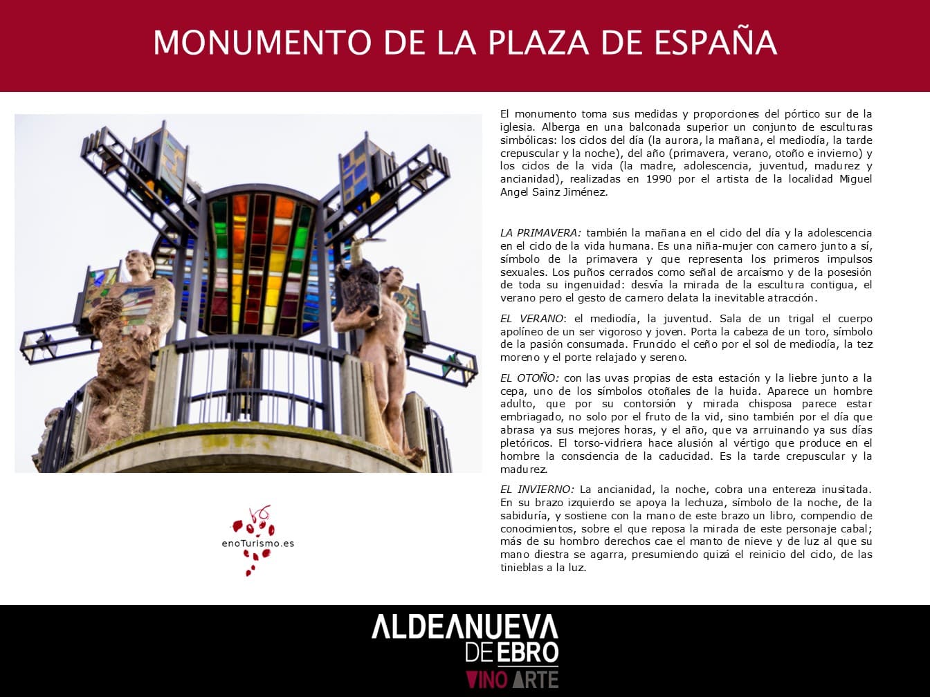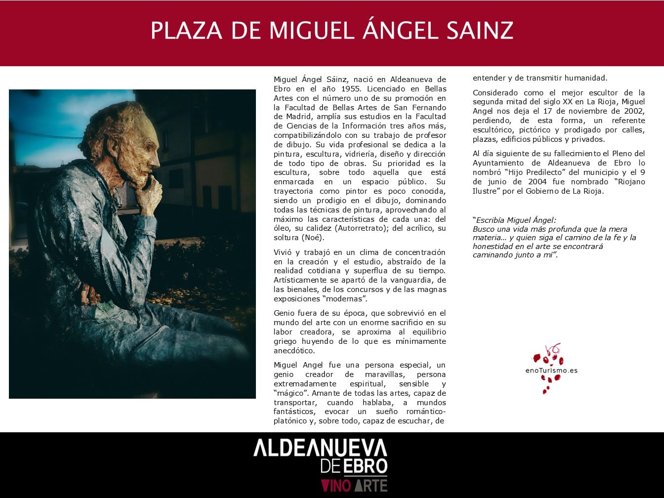Enoturismo y arte de Miguel Ángel Sainz invaden Aldeanueva de Ebro. Miguel Ángel Sainz fue un pintor y escultor nacido en Aldeanueva de Ebro el 4 de julio de 1955 que plasmó parte de su enorme talento artístico en la localidad riojana. Fue número uno de su promoción (1974-1979) en la Facultad de Bellas Artes de San Fernando de Madrid, por lo que esta afirmación no es algo tan subjetivo como a priori pudiera parecer. En Aldeanueva existe un recorrido por el casco urbano donde se puede disfrutar de la obra que allí construyó, así como de su taller, que dirige su sobrina y discípula María Pilar. En 1990, construyó en la Plaza de España un monumento lleno de esculturas simbólicas que representan las estaciones del año, las horas del día y las edades de las personas. Unos años antes, en 1979, Miguel Ángel homenajeó al amor, la juventud y la vida con una serie de elementos que añadió al grupo escultórico de La Fuente, cuyo empedrado reconstruyó el original de 1779. Como reconocimiento a su labor, cuenta con una figura de su persona situada en la Plaza de La Libertad y que fue realizada por la sobrina del artista, Mapi Gutiérrez. La cultura y el enoturismo van de la mano en Aldeanueva de Ebro.